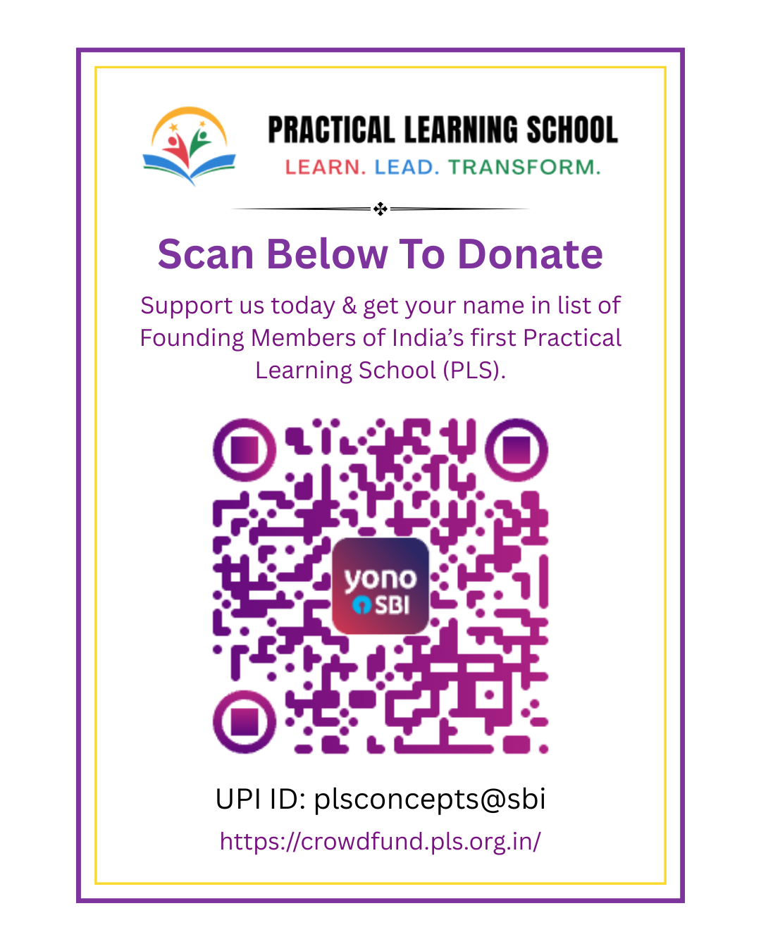 Your contribution can shape the destiny of countless children across India. Donate today and become a Founding Member of Practical Learning School (PLS), a revolutionary concept that will set a new benchmark for the future generation of India. Your name will forever be remembered among those who dared to change the meaning of education. Get your name on Practical Learning School founding members list by donating above Rs. 5000/- See list of Founding Members